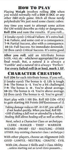 World Of Dungeons meets Dungeon Crawl Classics: "WoLph" is a one-sheet pamphlet ttRPG that borrows heavily from the elegantly simple World Of Dungeons to play a stripped down version of DCC.