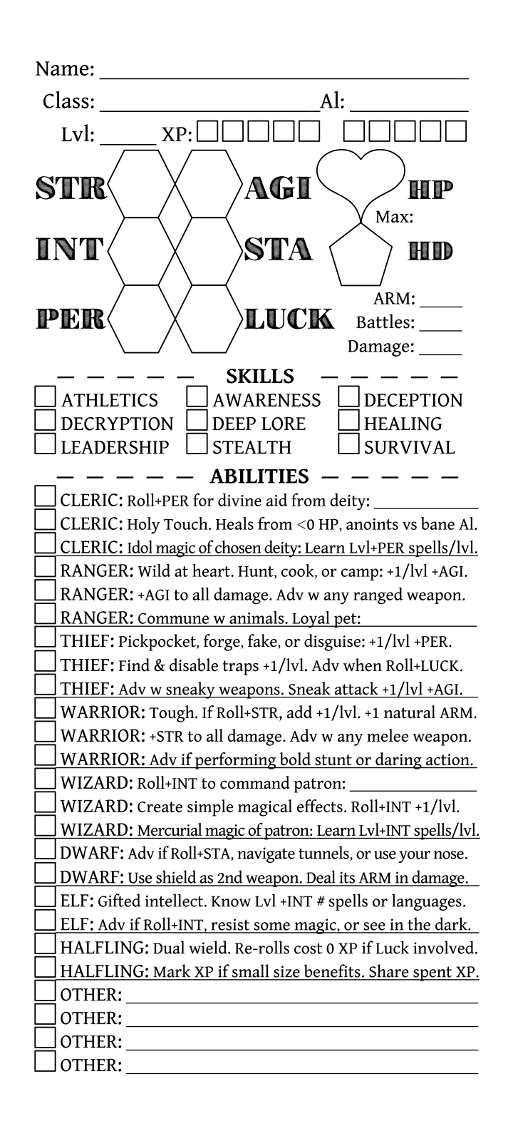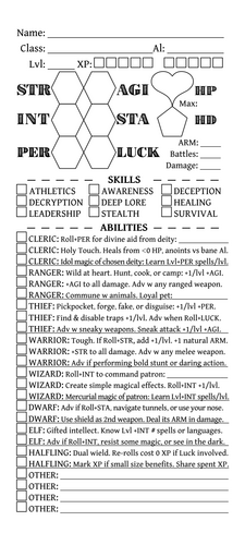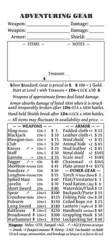 I'm a big fan of the DCC community and the game's classic 70s fantasy with a gonzo twist. I've also been feeling the call to simplify my game into something quicker and more narrative-driven. I admire the game hacking community here on itch, especially simple one-sheet games. And so, this project is my love letter to all you lovely people, including John Harper who inspired me to create my own unique hack of his amazing game, World Of Dungeons.